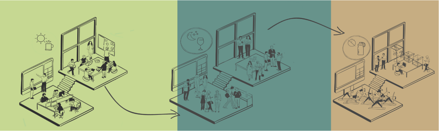 Nous interrogeons les modes d’organisations et d’occupations des lieux. En modulant les horaires, les usages et la densité d’utilisateurs, nous augmentons la valeur d’un espace sans en augmenter la surface.
